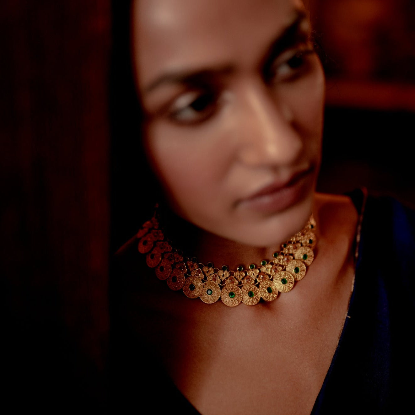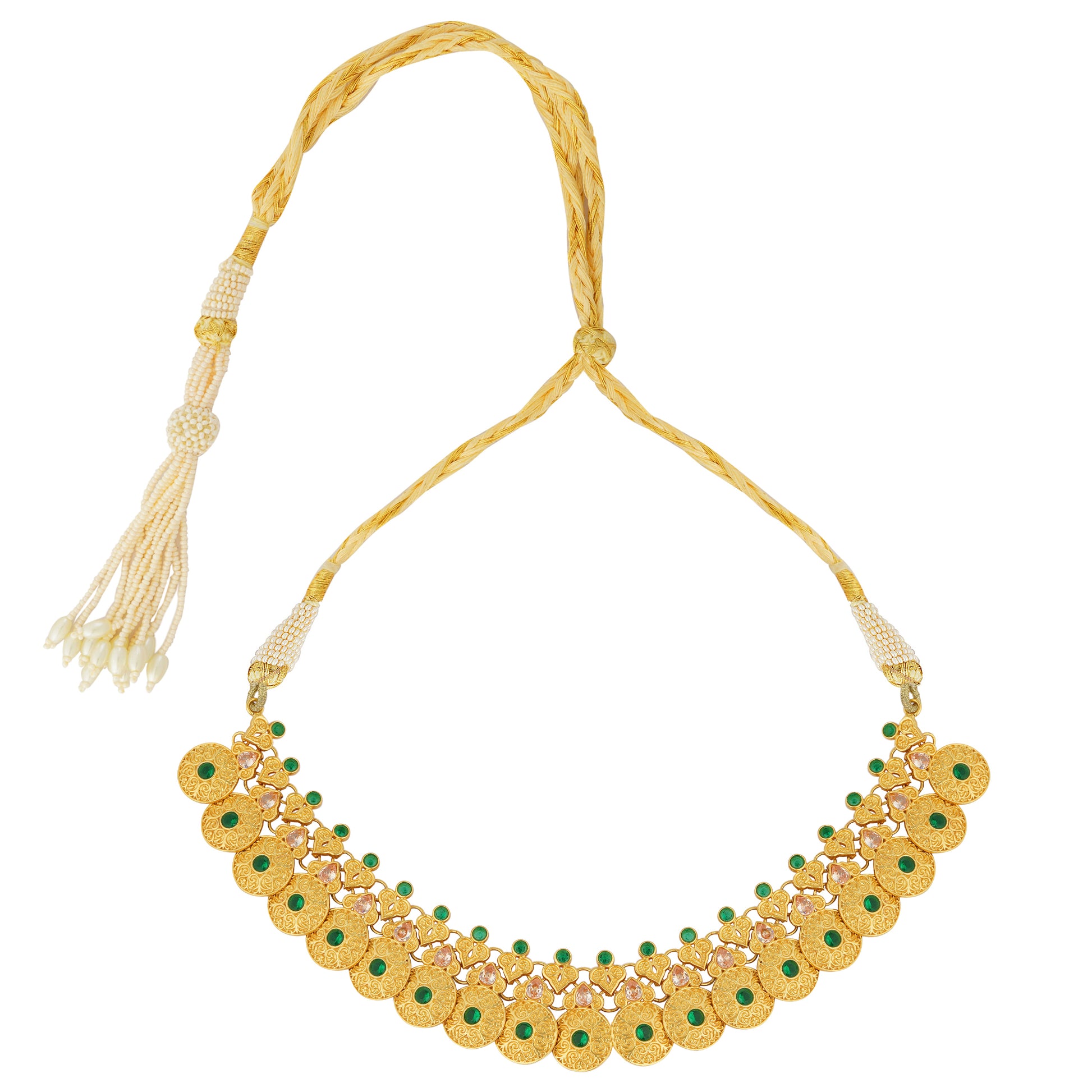 This 22kt gold-dipped necklace features intricate filigree details, green and champagne cz, and Mughal-inspired design. A fusion of colors and craftsmanship, it adds a touch of luxury and royalty to bridal or special occasion looks.