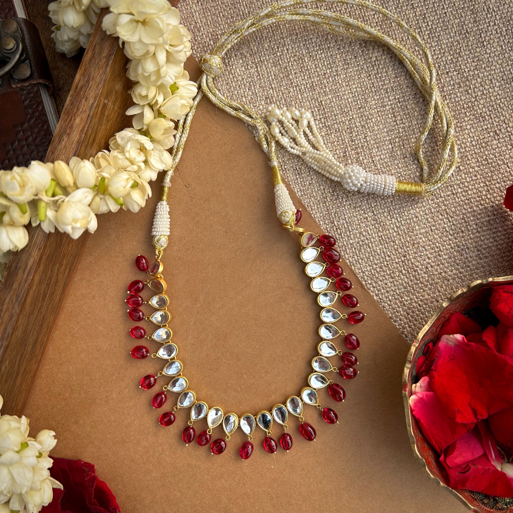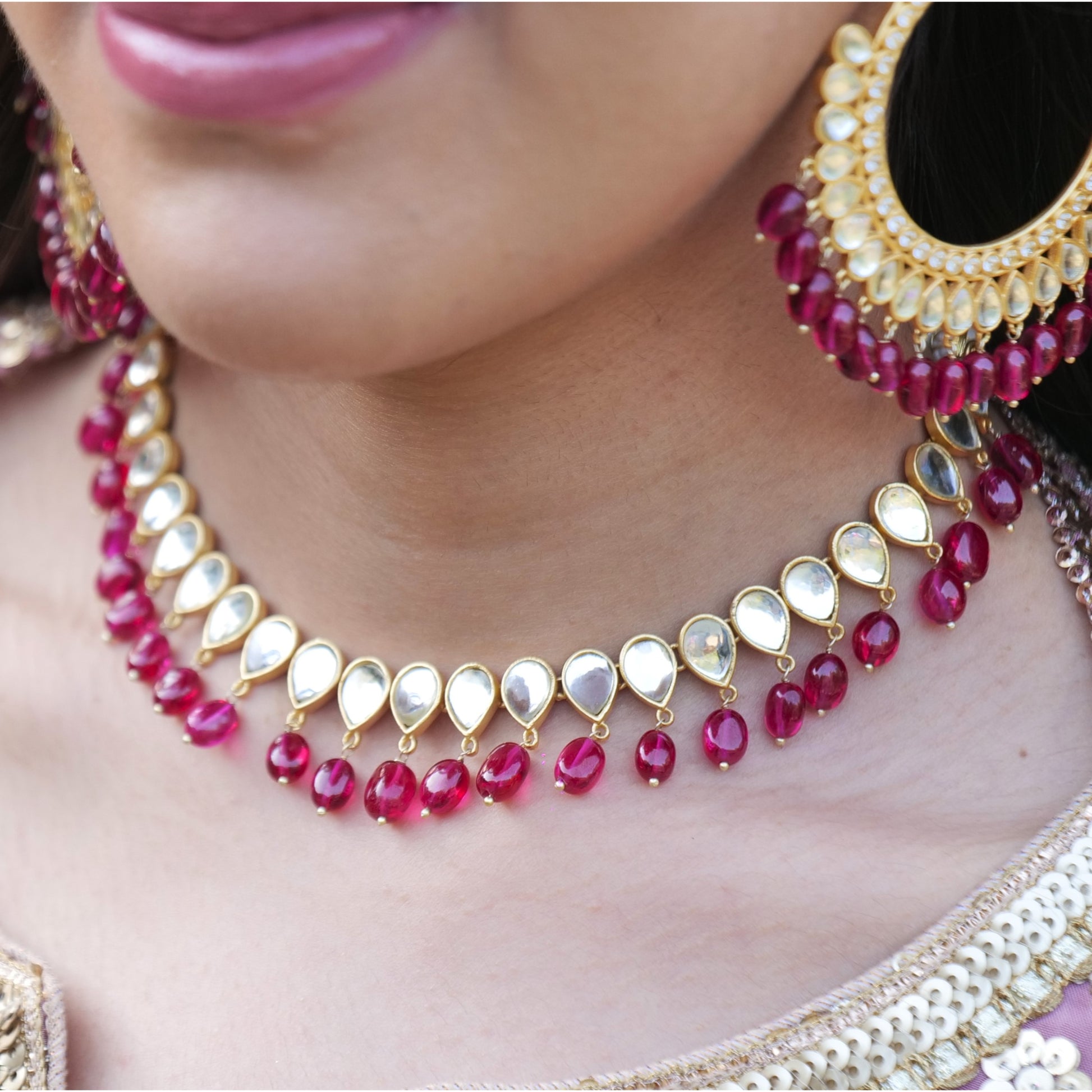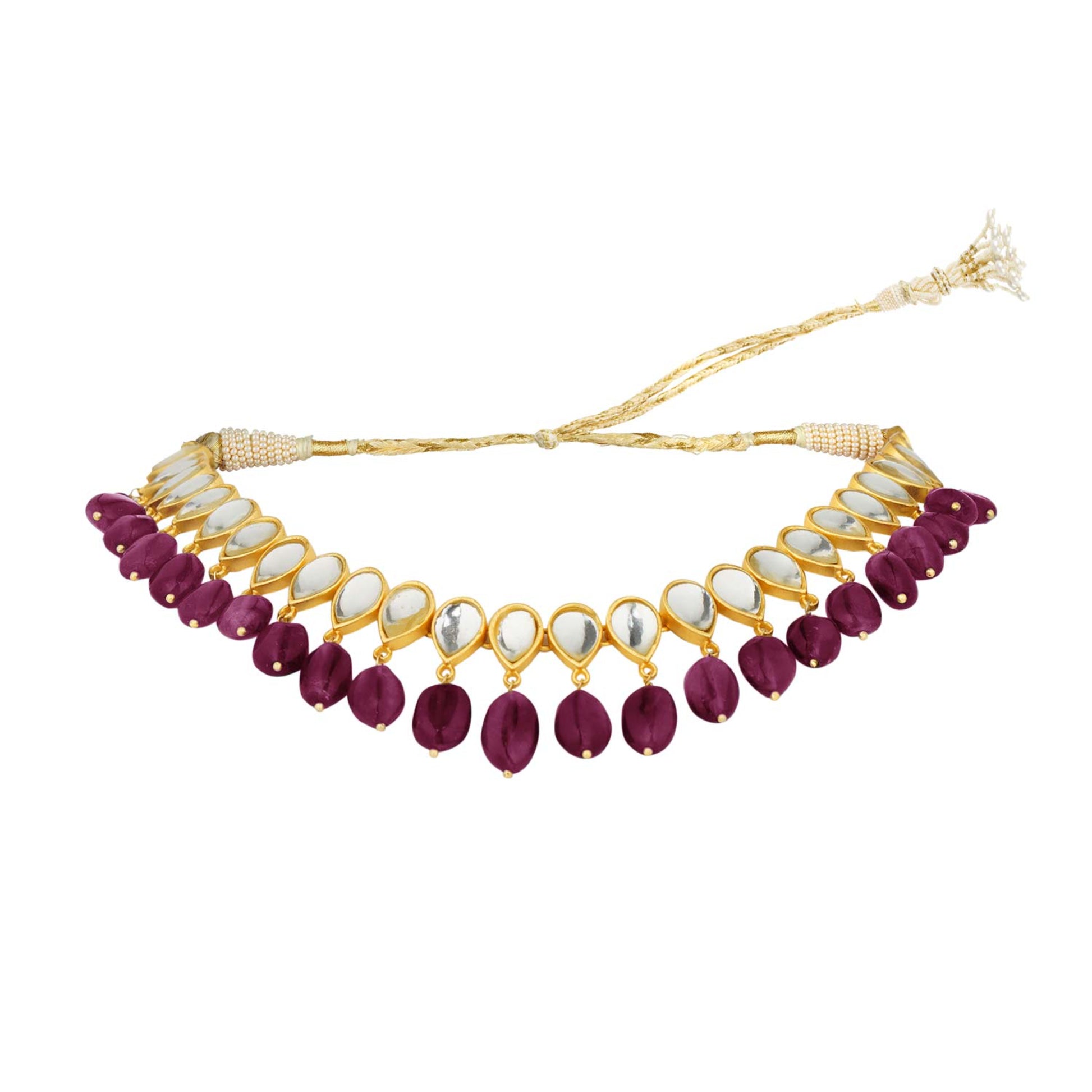 Adorn yourself with this delicate 22kt gold-plated choker necklace featuring mirror polki and Rani Pink stones. This piece adds a splash of color to your outfit, perfect for bridesmaids, wedding guests, and bridal favors. Available in three color options.